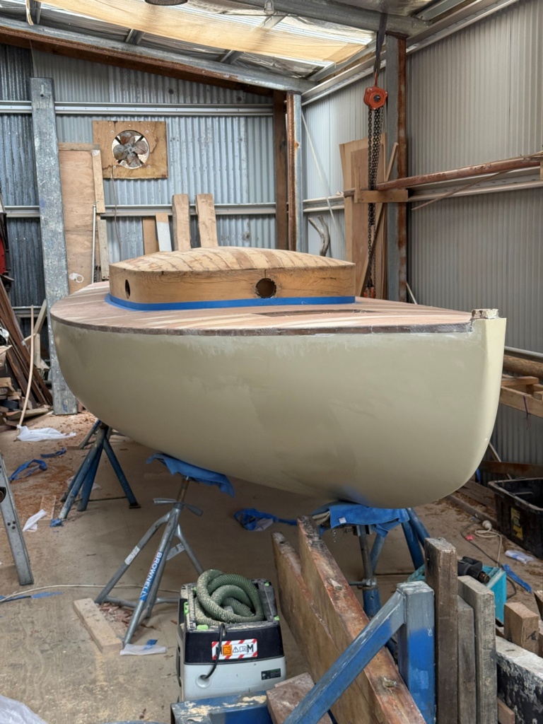 The latest little D-Class yacht D16, called “Peri”, is edging closer to completion, undergoing the final stages of her restoration by the timber experts at Tasmanian Shipwrights & Co in Kettering, Tasmania.