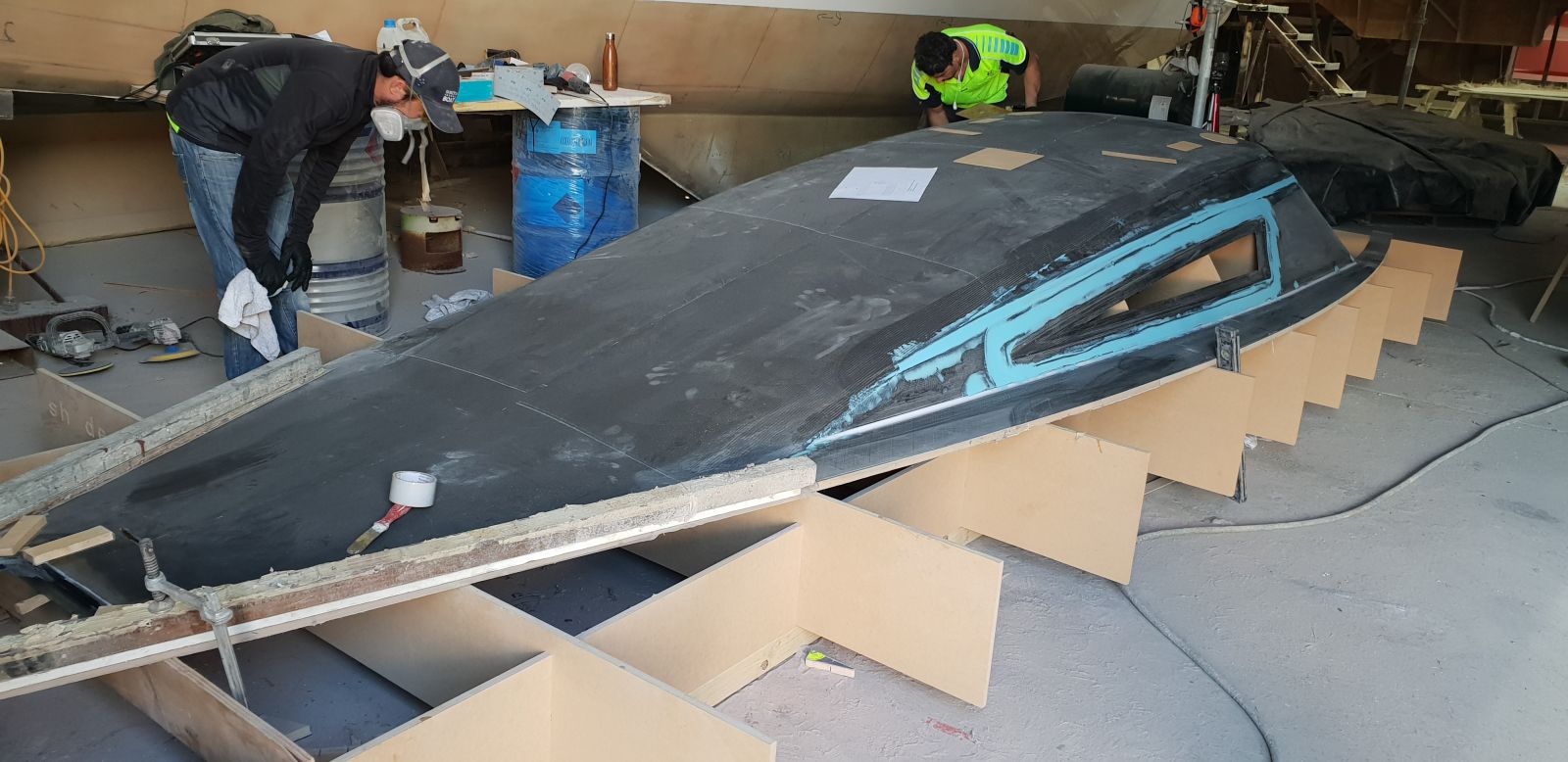 The cabin top and floats were strip planked with DuFLEX H80 strips with a 450grm uni-directional on either side to achieve the compound shapes and then reinforced with additional laminates to complete the structure.