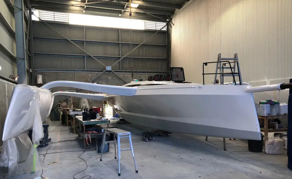 Engineered by Composites Consulting Group (CCG) to Category A Offshore, the R42 designed by Tony Grainger, is the latest high performance trimaran under construction at Australian Custom Multihull Yachts at The Boatworks on Queensland’s Gold Coast.